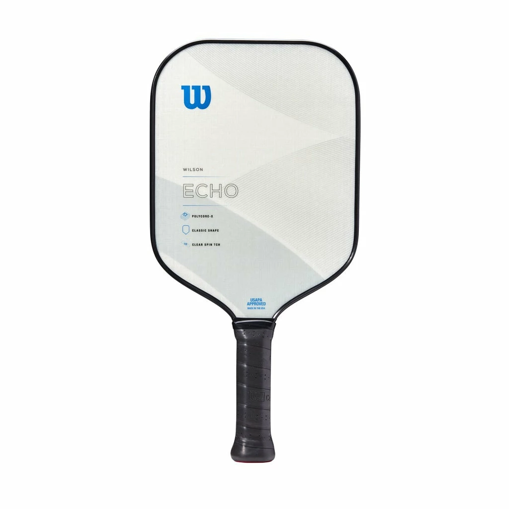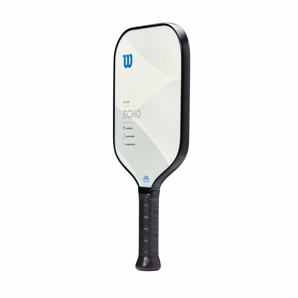 Wilson’s answer for players that want more on court, the Wilson Echo pickleball paddle delivers touch and feel perfectly. The Echo features an extended length handle to benefit players that like a two-handed backhand while the angled throat provides comfort and control on your shots. The honeycomb polymer core dampens vibrations but provides excellent feel. The hitting surface has Clear Spin TCH technology, a fiberglass composite that[s powerful and responsive.